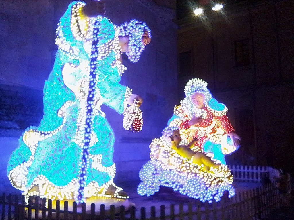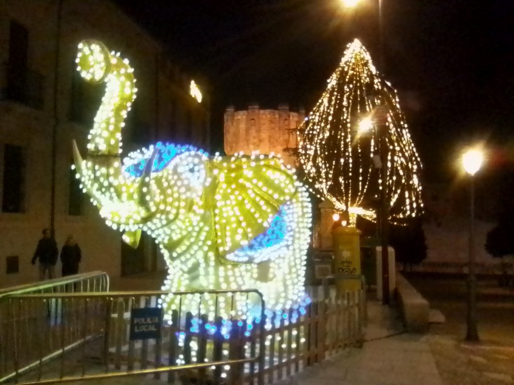 Últimamente la moda es llenarlo todo (pero todo todo todo) de lucecitas. Total son LED, gastan poco, valen poco… He aquí un ejemplo de hasta dónde se puede llegar en la confección de espantajos navideños. Habrá incluso gente a la que le gusten, claro, porque hay gente pa’ tó. Esta que ilustra el comentario de esta noche está en la plaza de Anaya de Salamanca, afeando la catedral. Por si acaso alguien, en su éxtasis contemplativo, se ha olvidado de que existe el puto astronauta, también han puesto a funcionar unos proyectores que te lo recuerda a tamaño descomunal sobre la fachada de la propia catedral.